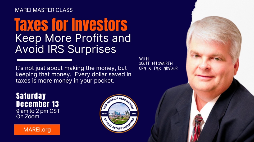 Join us for a power-packed Master Class with real estate tax guru Scott Ellsworth, CPA & Tax Advisor, as he translates tax jargon into plain English and gives you tools you can use from your very next deal.